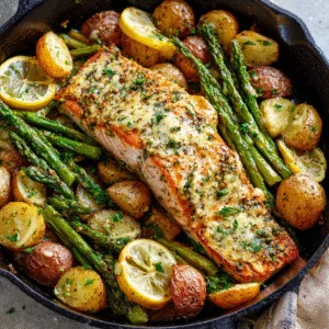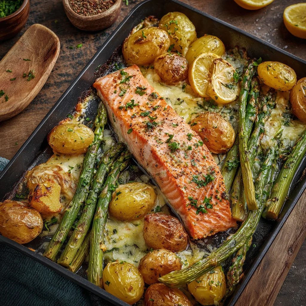 This dish is a celebration of simple ingredients coming together in perfect harmony — golden, crispy potatoes, tender asparagus smothered in cheese, and melt-in-your-mouth salmon that’s baked to perfection. It’s the kind of meal that feels fancy enough for guests but easy enough for a Tuesday night dinner. Plus, there’s minimal cleanup — just one pan!