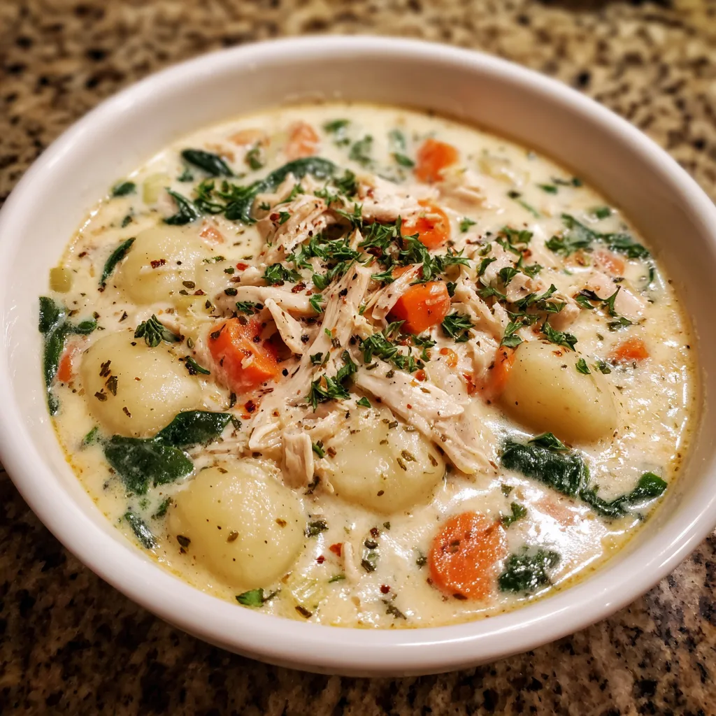 This soup has deep roots in Italian-American comfort cooking, where simple ingredients are transformed into something deeply satisfying. Soft, pillowy potato gnocchi, tender chicken, and a velvety cream-based broth come together with aromatic vegetables and herbs to create a dish that feels both indulgent and nourishing. It’s the kind of recipe that families pass down, tweaking it just enough to make it their own, while keeping the soul of the dish intact.