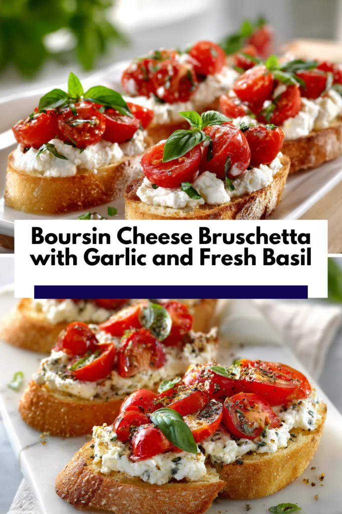 Delight in Boursin cheese bruschetta with garlic and fresh basil—crispy baguette slices topped with creamy herb cheese and vibrant tomatoes for a simple yet elegant appetizer.