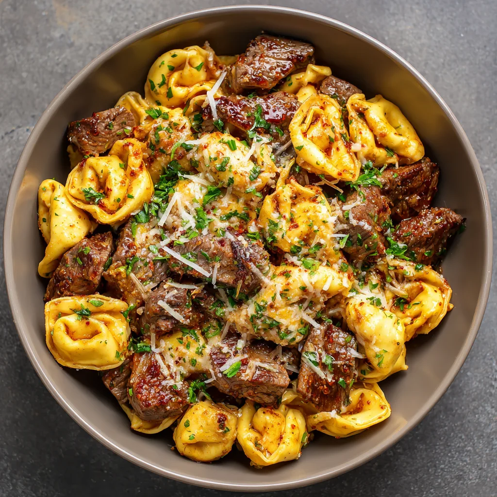 Add the cooked tortellini and seared steak back into the pan. Toss everything gently until the sauce coats each piece of pasta and steak evenly. Taste and adjust seasoning with salt and pepper if needed. - Serve and Garnish: