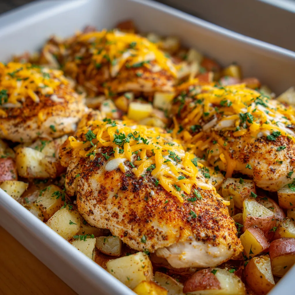 - Add the cheesy topping: Remove the foil, sprinkle the shredded cheddar and mozzarella generously over both chicken and potatoes. Return the dish to the oven, uncovered, and bake for another 10–15 minutes, or until the cheese is fully melted, bubbly, and lightly golden.