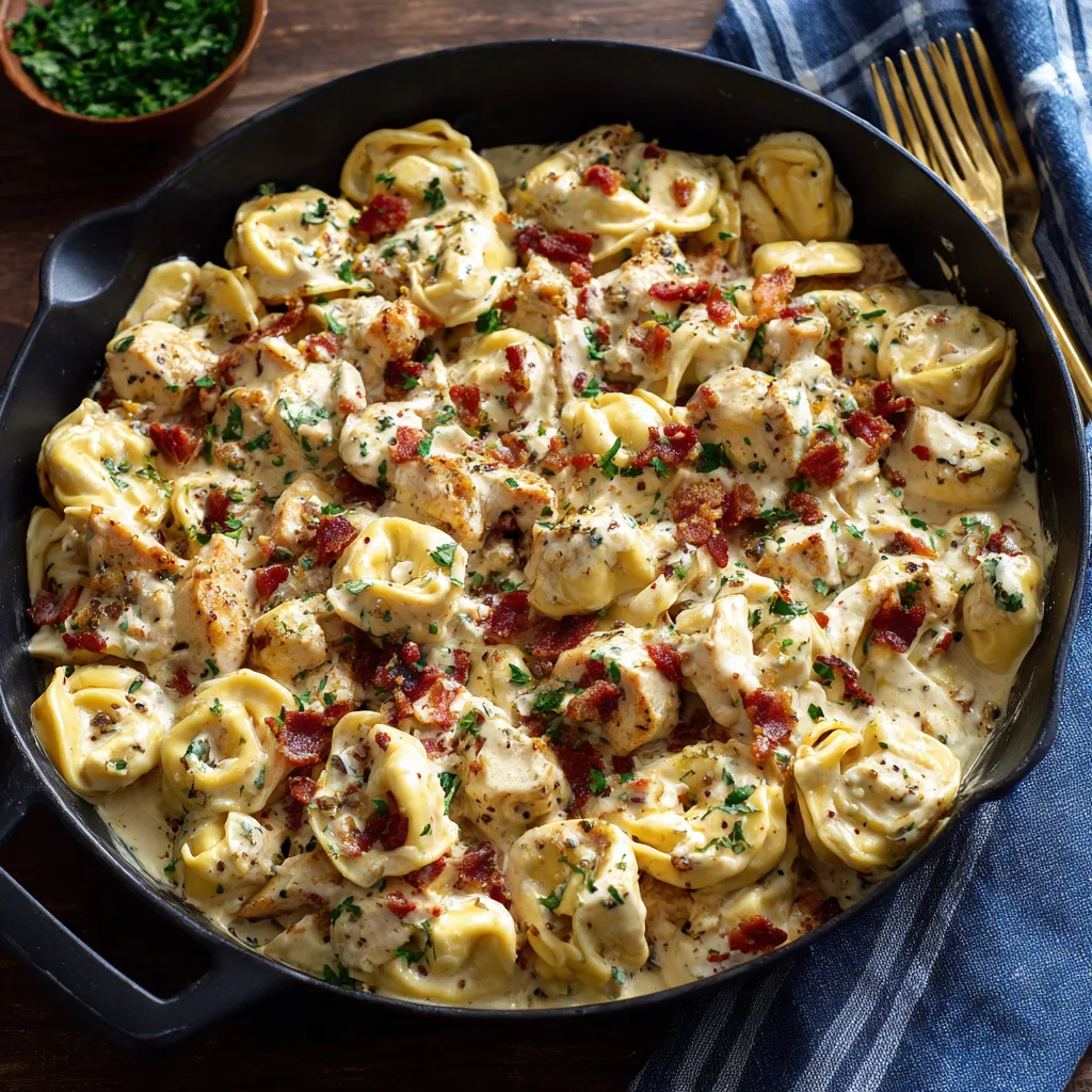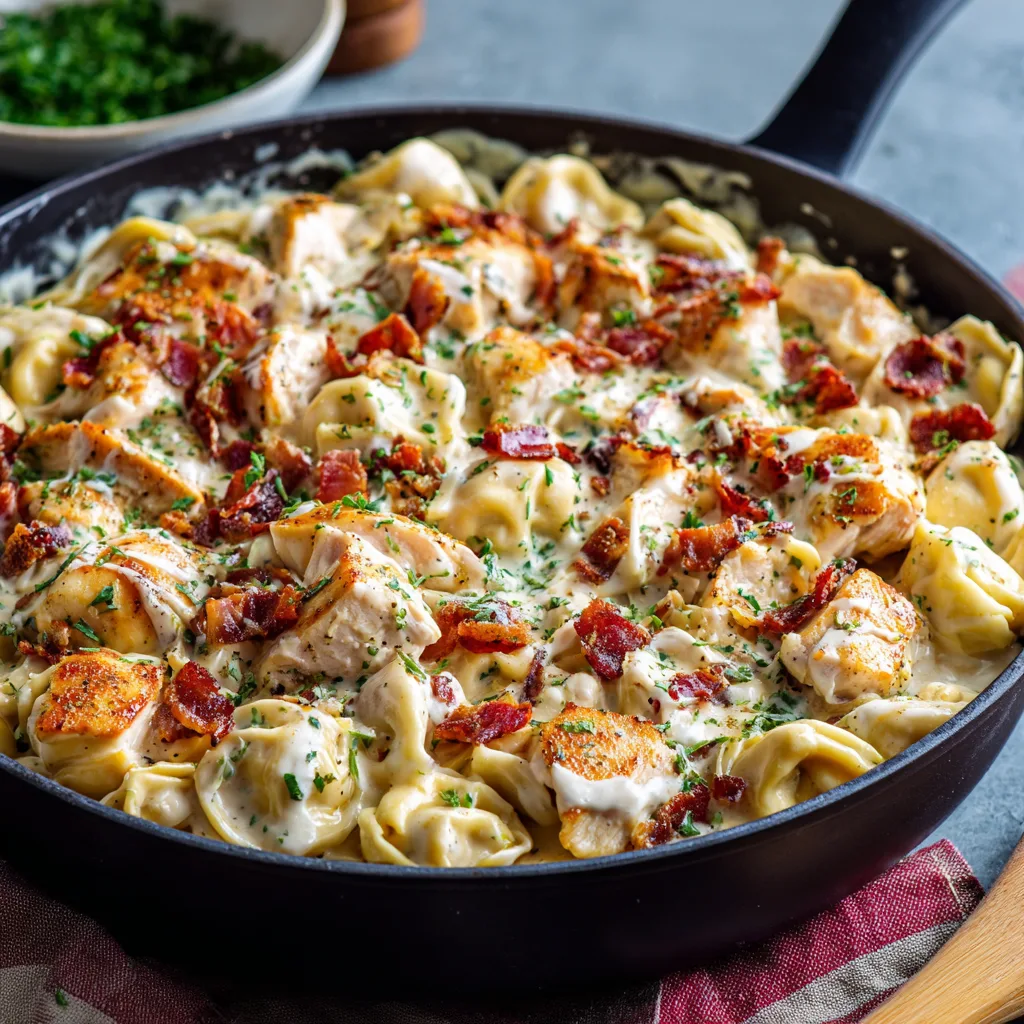 Add the cooked tortellini, chicken, and crumbled bacon into the skillet. Toss well so everything is coated evenly in the sauce. Let it simmer for 2–3 minutes so the flavors can mingle beautifully. - Finish and serve 🌿
