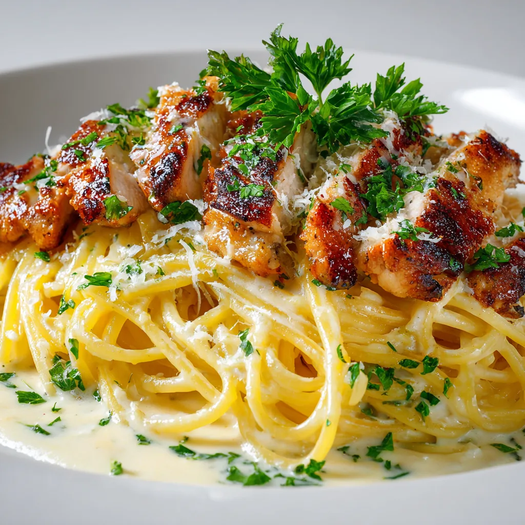 Creamy chicken carbonara pasta made with tender chicken, eggs, Parmesan cheese, and perfectly cooked pasta. A rich yet balanced comfort meal perfect for easy dinners.