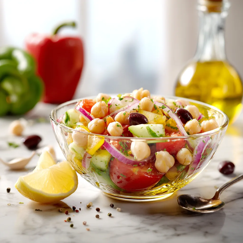 Enjoy a traditional chickpea salad with olive oil and lemon, a fresh Mediterranean recipe made with simple ingredients, vibrant flavors, and wholesome goodness.