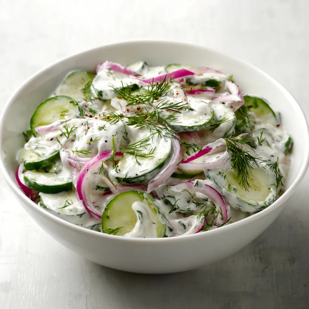 A classic creamy cucumber salad made with fresh cucumbers, sour cream, dill, and a tangy dressing. This refreshing side dish is simple, traditional, and perfect for any meal.