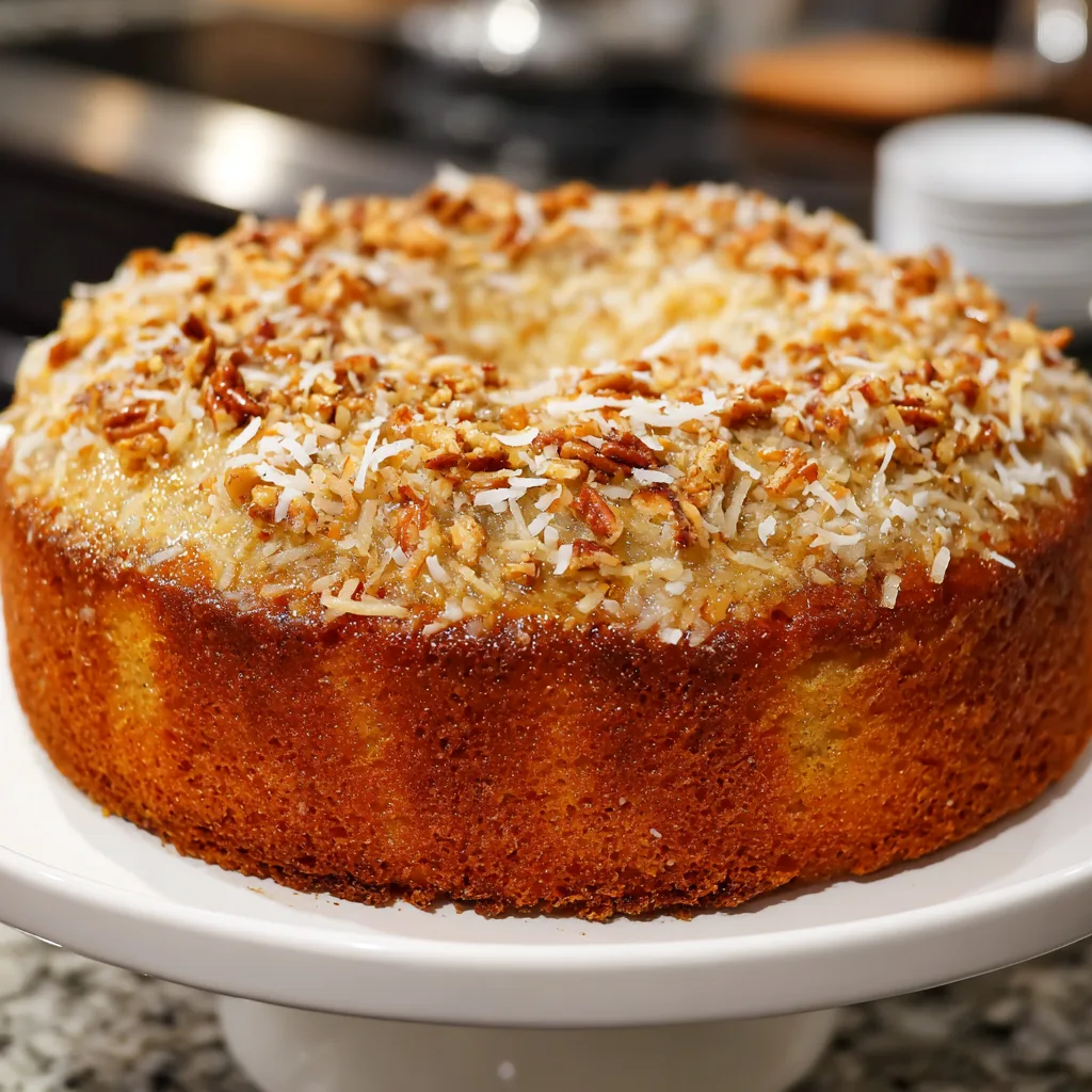 The beauty of this cake lies in its simplicity. Buttermilk creates a tender, moist crumb with a gentle tang that balances sweetness perfectly. Coconut brings a soft chew and natural sweetness, while pecans add warmth, crunch, and a nutty richness that feels unmistakably Southern. Together, these ingredients create a cake that doesn’t need layers, frosting swirls, or elaborate decoration. Its signature coconut pecan topping becomes the star, cascading gently over the cake and settling into every nook for maximum flavor. 💛🌴