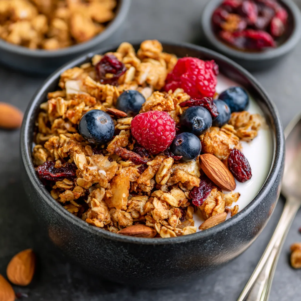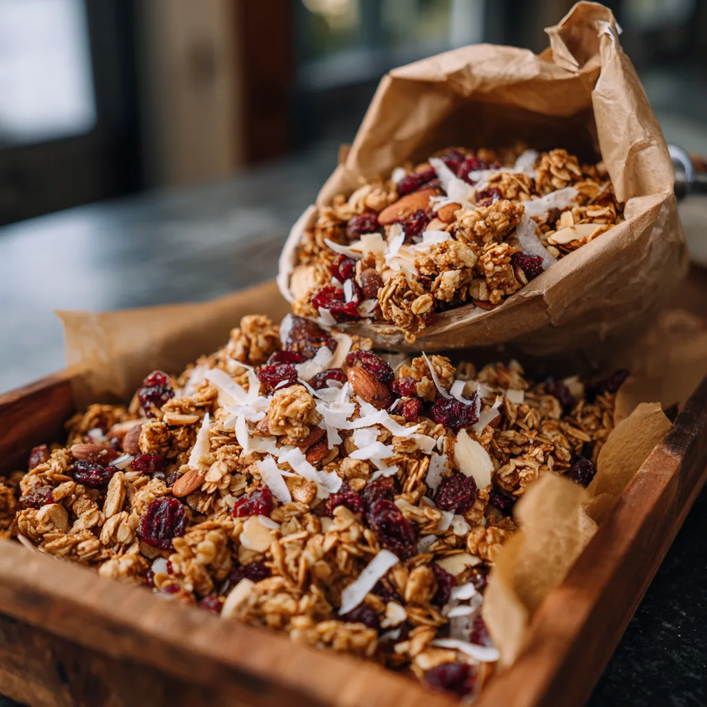 Traditional granola has always been about simple, hearty ingredients mixed with love: toasted oats, nuts, a touch of sweetness, and dried fruits. Back in the day, people baked granola in big batches to store for the week—perfect for busy mornings, hikes, or a comforting snack beside a warm cup of tea. This cranberry almond version carries that same old-fashioned spirit, combining tart red berries with the buttery crunch of toasted almonds.