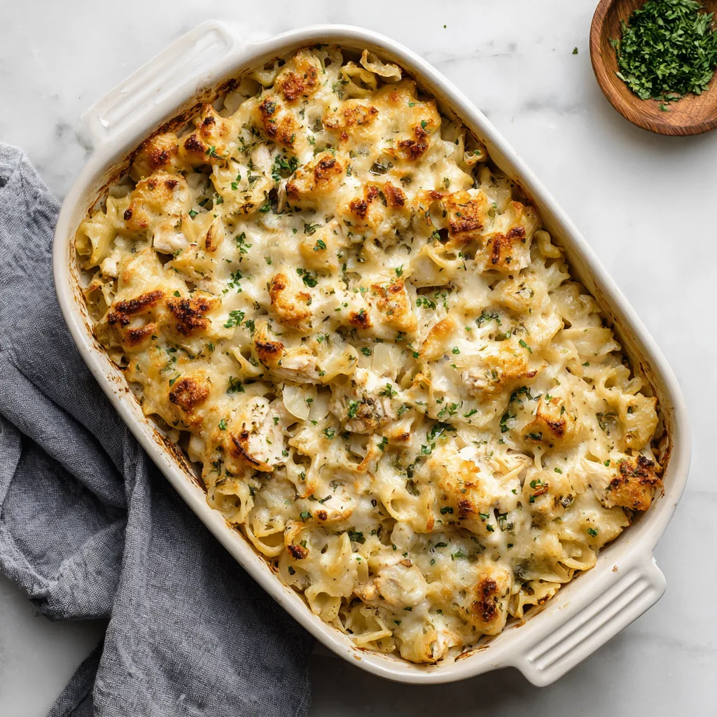 Creamy Garlic Chicken Pasta Bake – Easy Family-Style Casserole