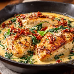 Tuscan-style cooking has always celebrated balance: tender meats, fragrant garlic, creamy sauces, and bursts of freshness from herbs and vegetables. In this recipe, juicy chicken breasts are gently simmered in a rich cream sauce infused with garlic, sun-dried tomatoes, and spinach. Everything cooks in one skillet, making it perfect for busy weeknights when time is short but the desire for a wholesome, satisfying meal is strong.