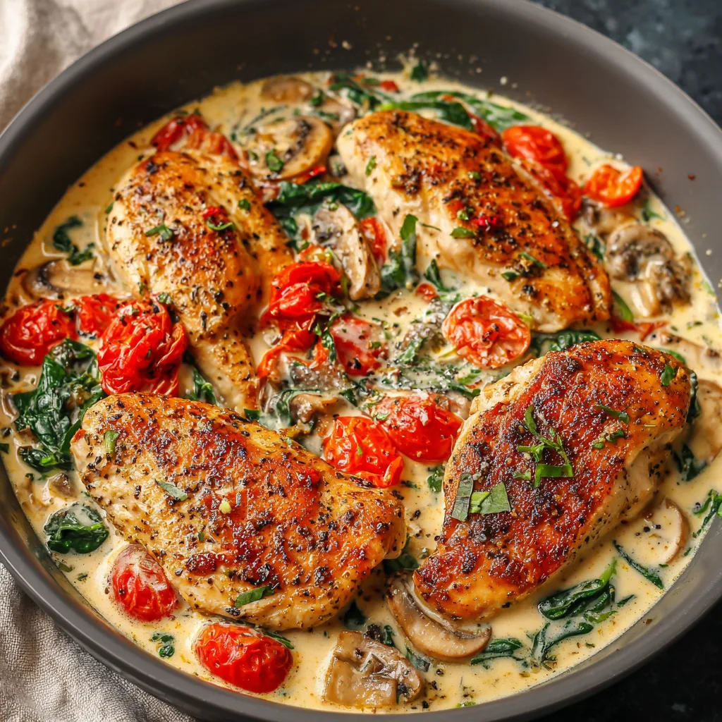 Tuscan-style cooking has always celebrated simplicity: good ingredients, gentle cooking, and sauces meant to be soaked up with every bite. In this recipe, tender chicken breasts are lightly seared, then simmered in a creamy garlic sauce enriched with sun-dried tomatoes and wilted greens. Everything happens in one skillet, which means fewer dishes and more time to actually enjoy your evening.
