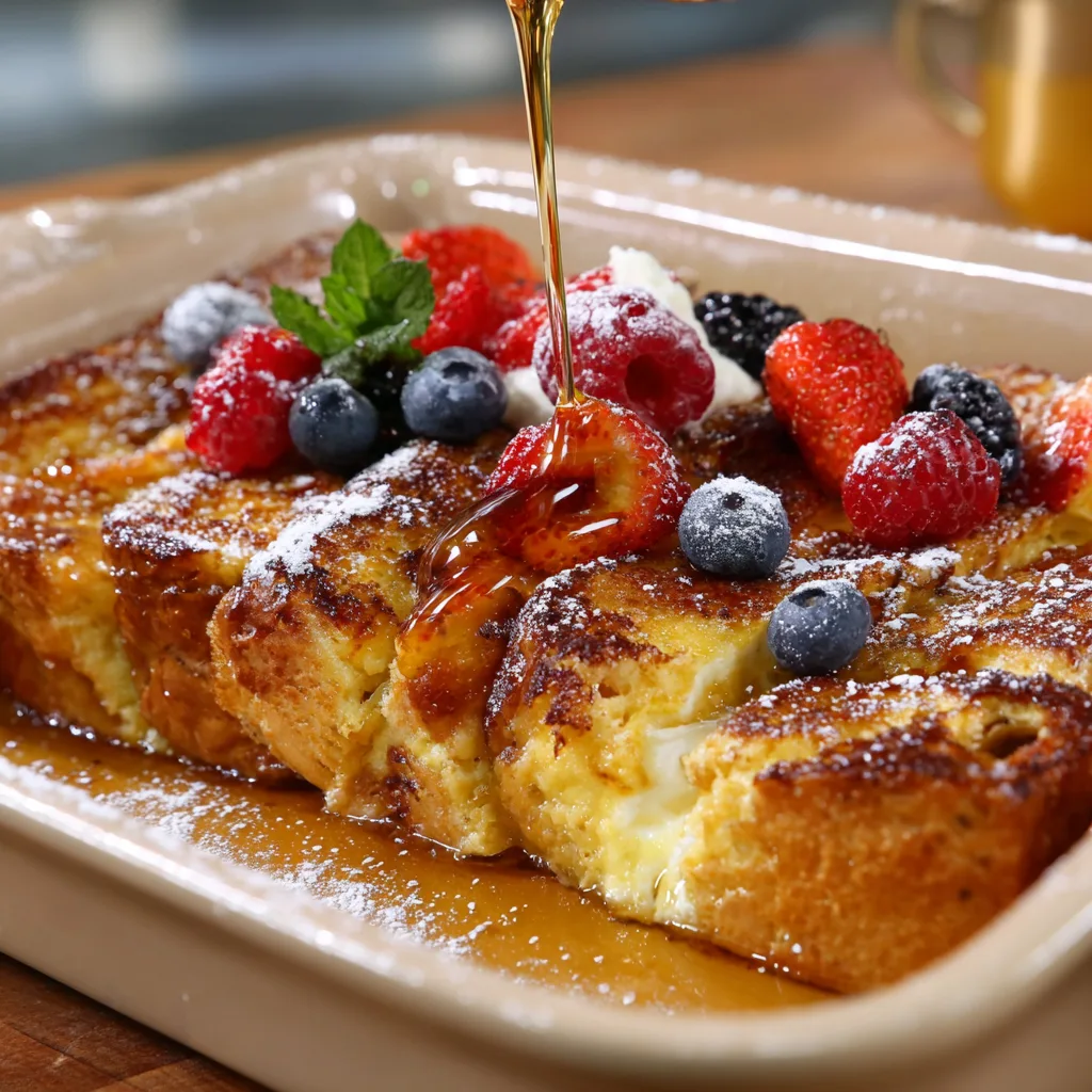 French toast has long been a staple in many cultures, transforming leftover bread into something precious. In this version, the inspiration reaches a little further into French pastry tradition. Crème brûlée’s iconic caramel layer becomes the golden, buttery base of this bake, creating a luxurious contrast between crisp edges and soft custard-soaked centers.