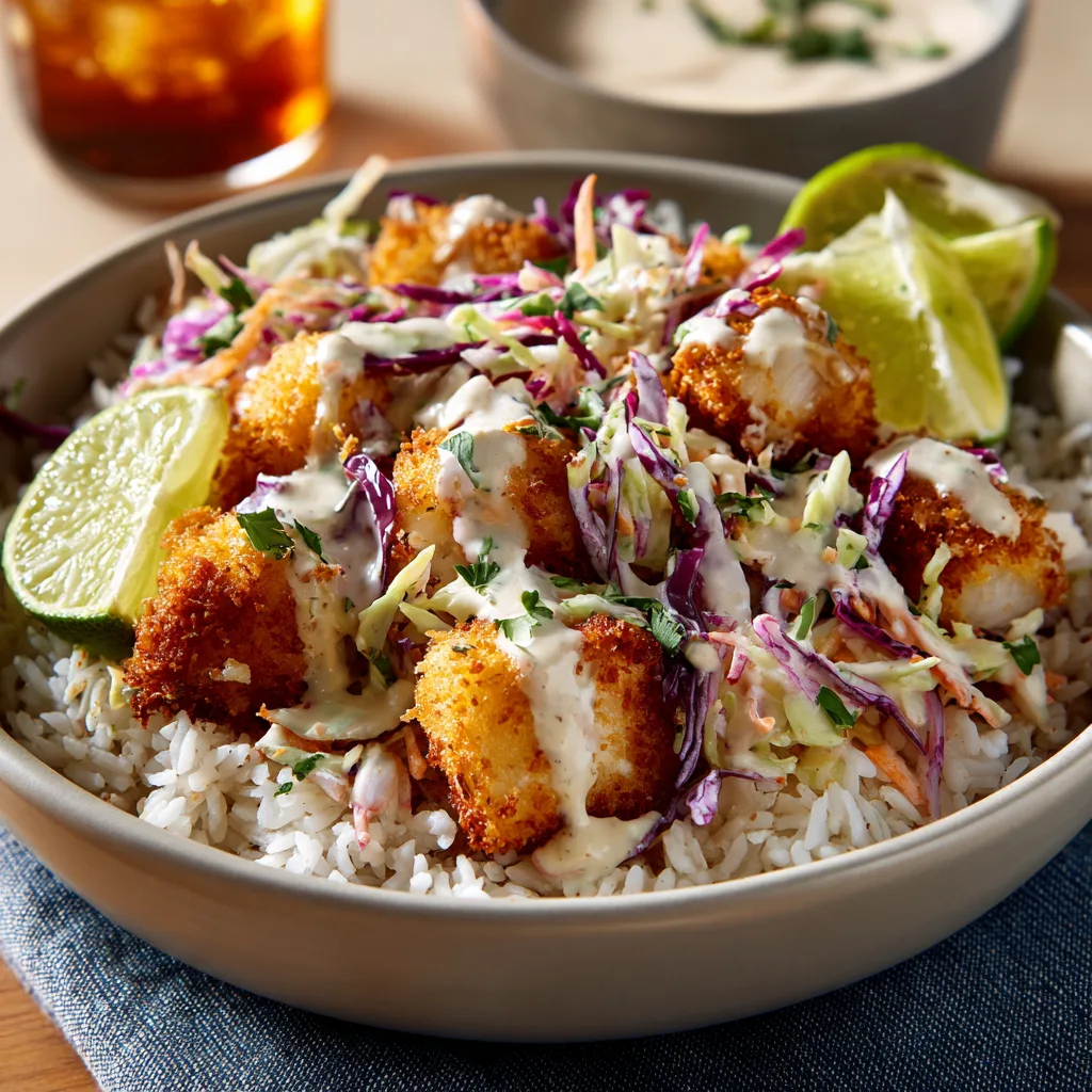 Imagine all the joy of a fish taco — the crispy fish, the zesty slaw, the creamy sauce — but served in a nourishing, colorful bowl. This recipe brings together golden-battered fish bites, fluffy rice, crunchy cabbage, tangy lime crema, and all your favorite taco toppings. It’s fast, fun, and totally customizable!