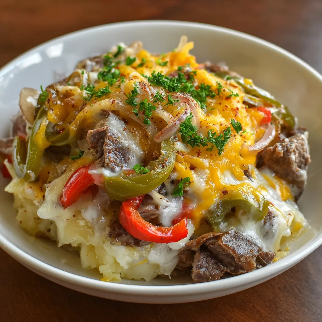 These wholesome ingredients create a hearty and satisfying casserole layered with classic cheesesteak flavor.