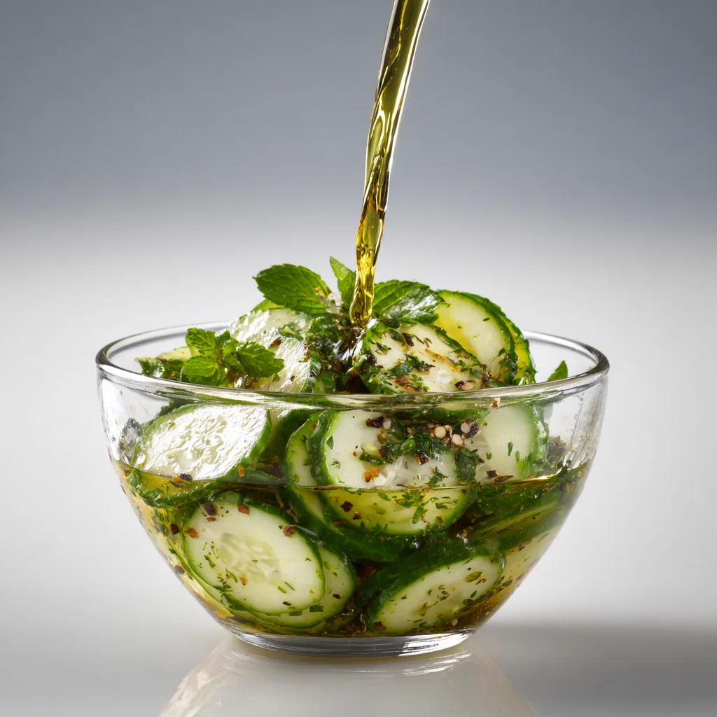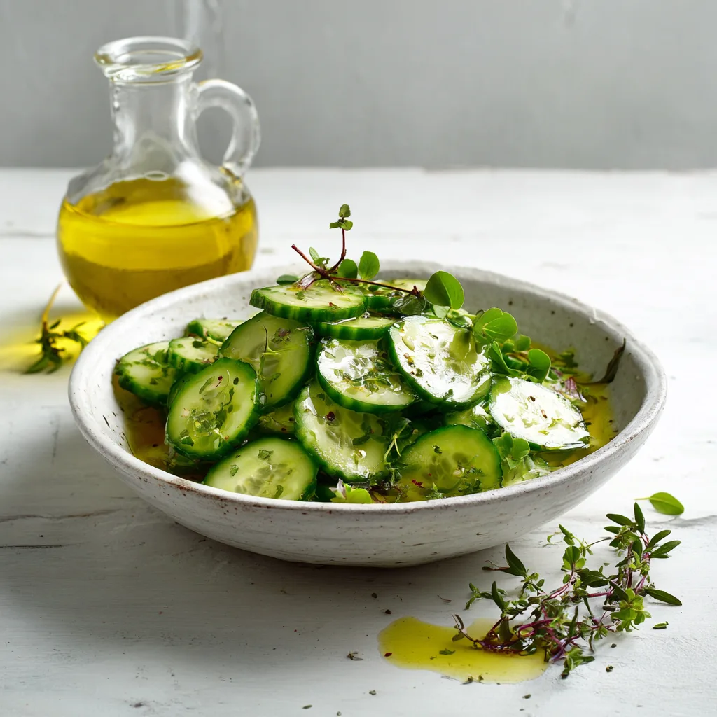 A fresh cucumber salad with olive oil and herbs, light, crisp, and perfect as a healthy traditional side dish.