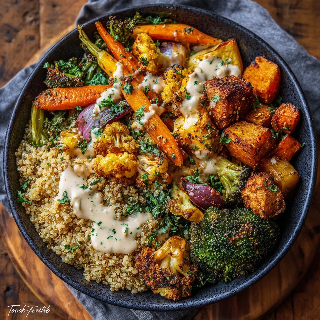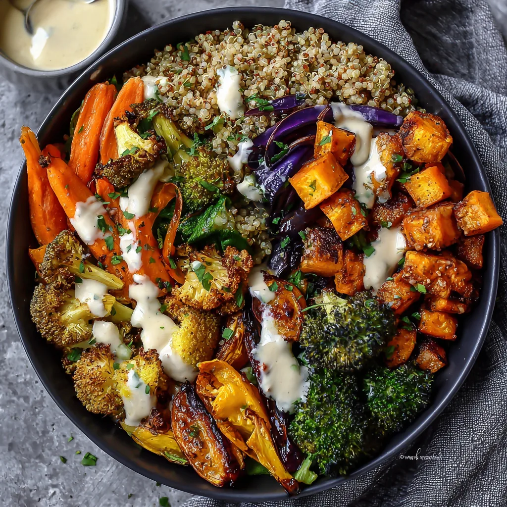 This dish isn’t just a feast for your taste buds — it’s food for your soul. Inspired by traditional Mediterranean flavors and the wisdom of balance in every bite, this Glow Bowl with Roasted Veggies & Creamy Tahini Yogurt Sauce is perfect for lunch, dinner, or even meal prep for the week ahead. The beauty lies in its versatility — earthy roasted carrots, sweet potatoes, and broccoli mingle with protein-rich quinoa, while the creamy tang of the tahini yogurt sauce adds depth and harmony.