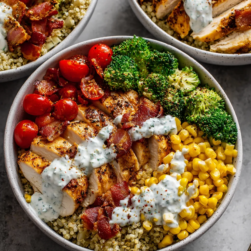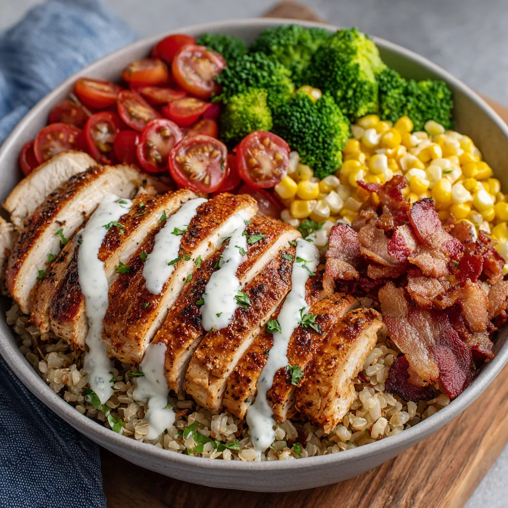 This bowl-style dinner is inspired by the modern home kitchen where balance matters. You want food that tastes indulgent but still supports your body, keeps you full, and fuels you through the rest of the day. Tender seasoned chicken, crispy bacon, fresh vegetables, and a creamy ranch-style drizzle come together in one satisfying bowl that feels both cozy and fresh.