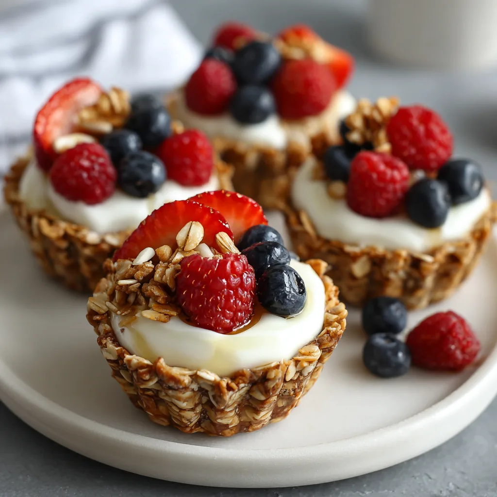 Spoon a generous dollop of the yogurt mixture over each granola base, smoothing the top with a spoon or spatula. You want a nice thick layer here! - Top with Fresh Berries: