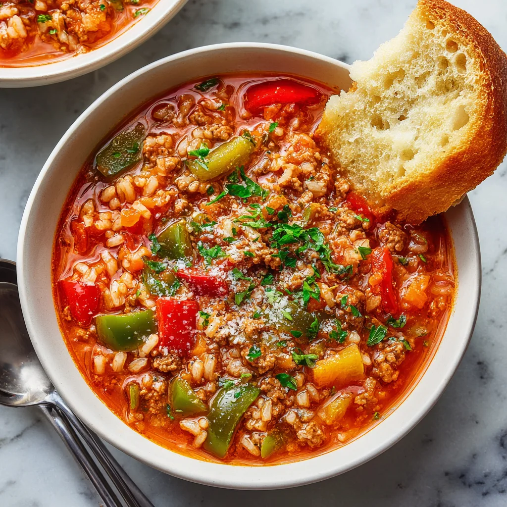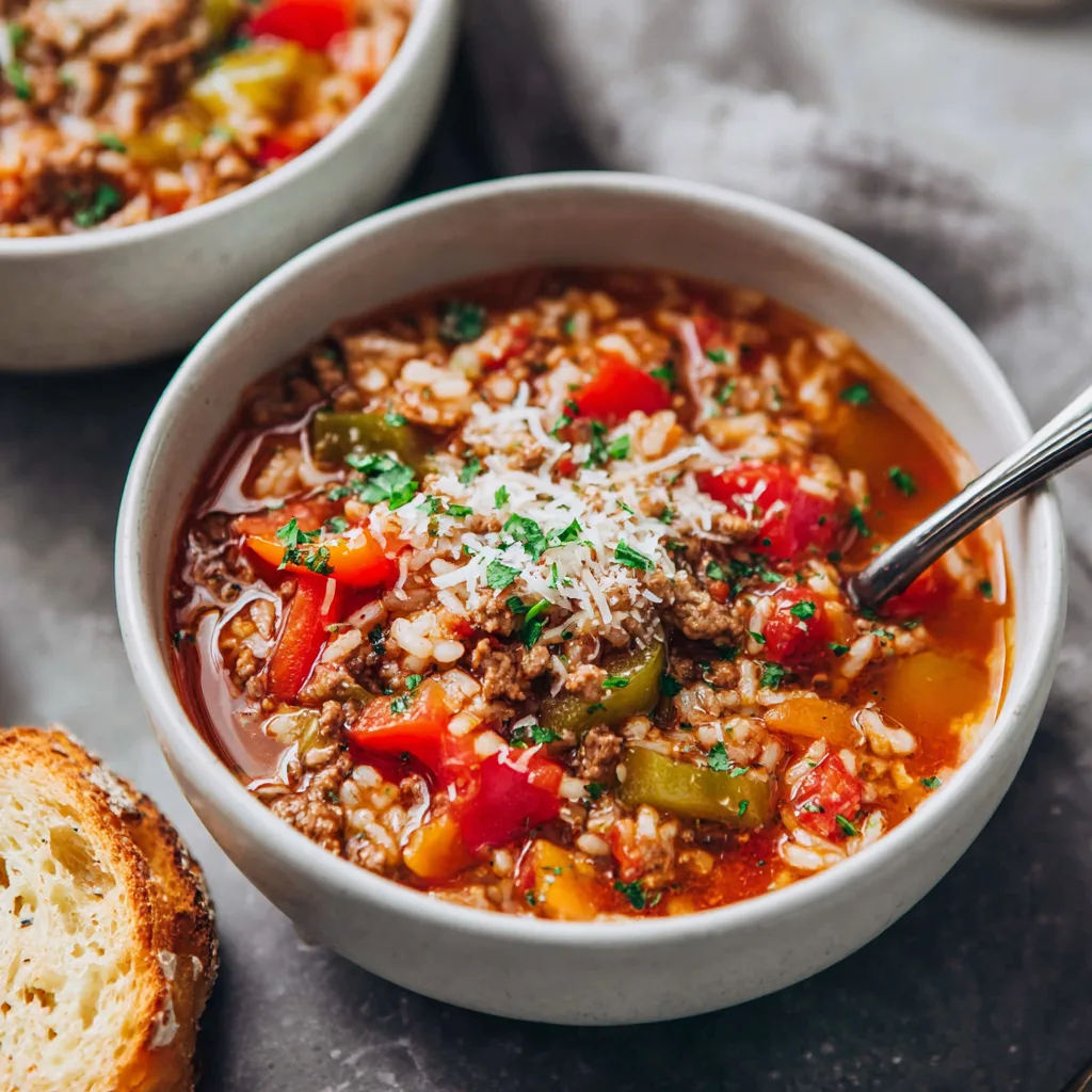 What makes this soup especially wonderful is its flexibility. Ground beef brings richness and depth, while ground turkey offers a lighter, leaner option without sacrificing comfort. Bell peppers, tomatoes, rice, and warm seasonings come together in a way that feels hearty yet balanced. It’s the kind of meal that fills the house with irresistible aromas and fills bellies just as generously.