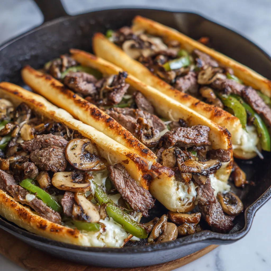 Heat olive oil or butter in a large skillet over medium-high heat. Add the onions, bell peppers, and mushrooms. Sauté until softened and slightly caramelized, about 5–7 minutes. - Cook the steak: