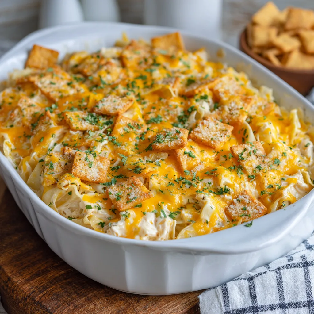 This recipe is rooted in classic American comfort cooking, the kind that brings everyone to the table with smiles and second helpings. It blends the nostalgic flavors of creamy casseroles with a luxe twist: a silky filling enriched with cream cheese, sour cream, and cheddar. The topping? Crushed buttery crackers that add the perfect crispy contrast.