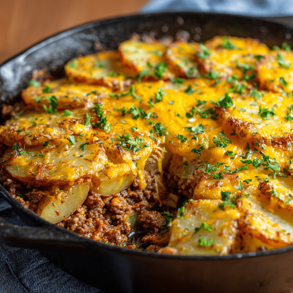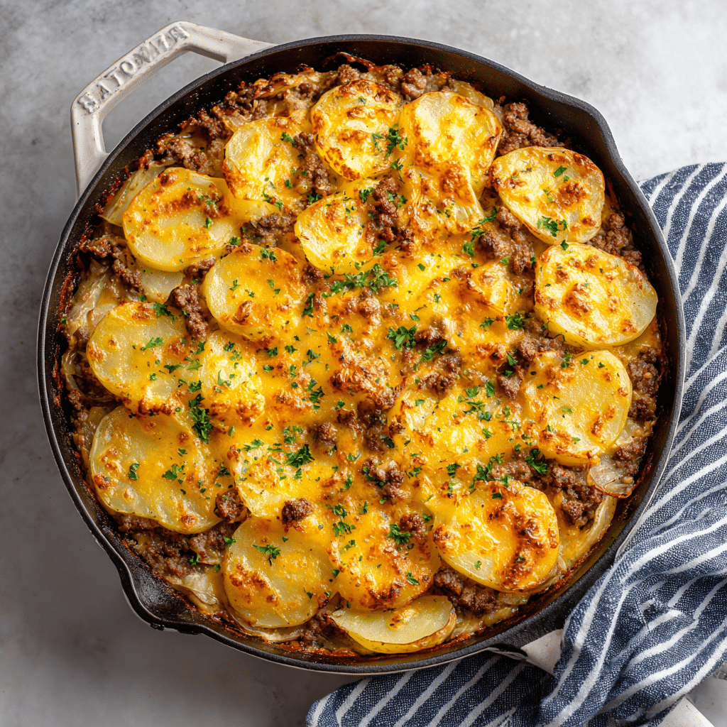 This humble recipe is all about comfort: tender ground beef, golden potatoes, onions, herbs, and a touch of cheese all layered together in one pan. The beauty lies not just in its flavor, but in its simplicity — it’s the kind of dish you prepare on a cool evening when you want your home to smell like love and warmth.