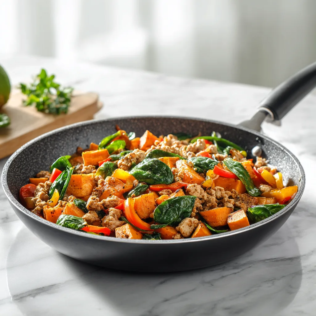 One Pan Healthy Turkey Sweet Potato Skillet is a quick, nutritious, and flavorful meal made with lean ground turkey, tender sweet potatoes, and fresh vegetables. Perfect for busy weeknights and meal prep.