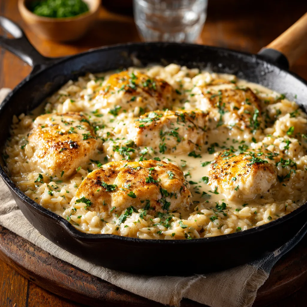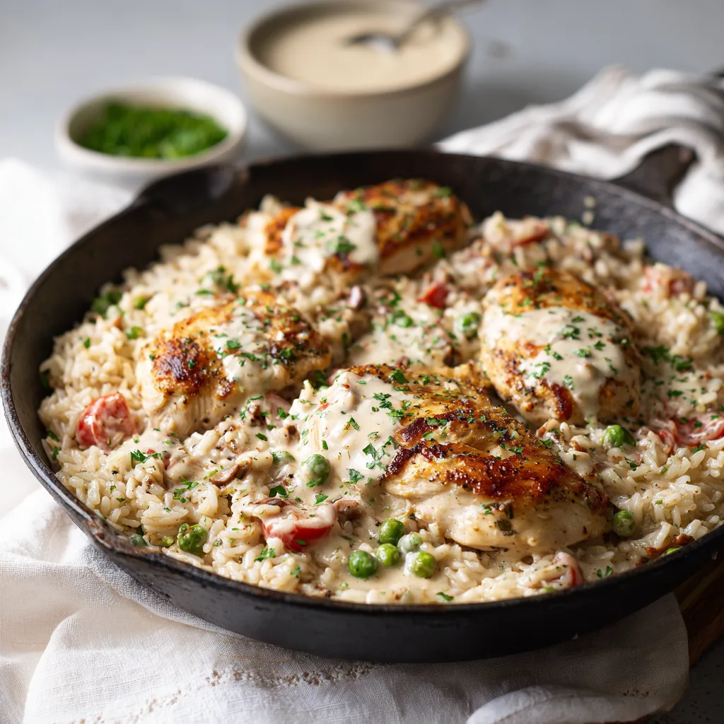 What makes this recipe special is its balance. It respects old-fashioned comfort food while embracing modern practicality. Everything cooks in a single skillet, saving time, effort, and cleanup—because good food should bring peace, not stress. The rice absorbs the savory chicken broth, the chicken stays tender and juicy, and the cream ties it all together into a silky, satisfying bite. ✨