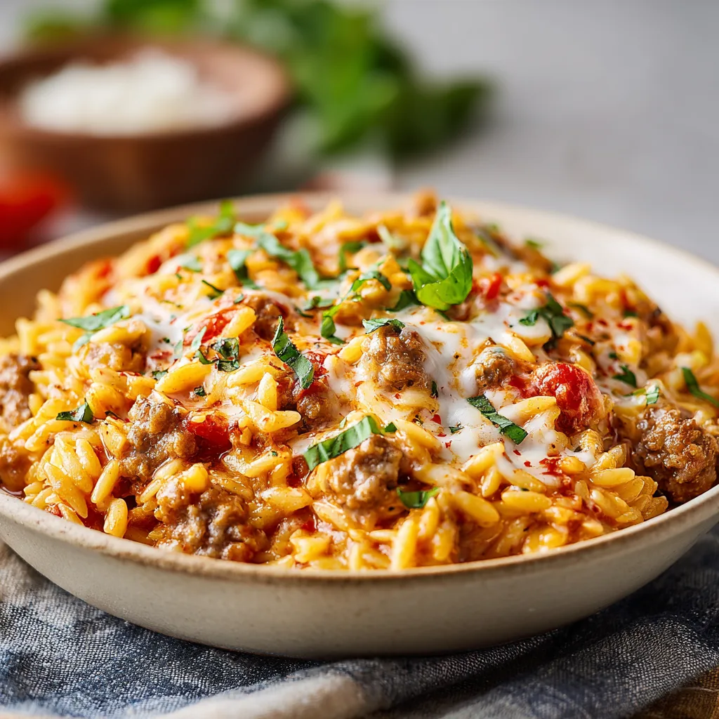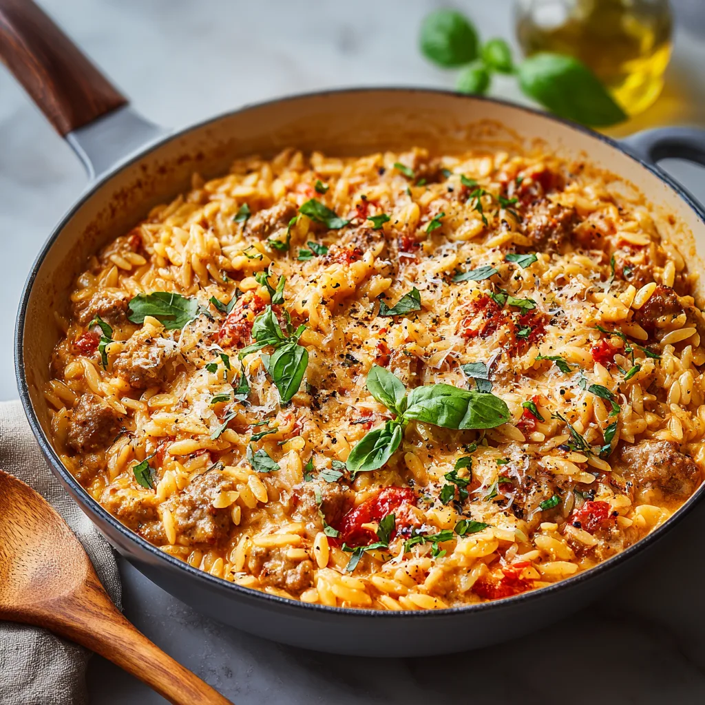 This dish shines on busy nights when you crave something warm, indulgent, and deeply comforting without spending hours in the kitchen. It’s the kind of recipe that fills the house with mouthwatering aromas—garlic sizzling, tomatoes simmering, sausage browning—inviting everyone to the table before you even call them. As the orzo cooks, it softens into a risotto-like texture that feels luxurious yet rustic, creating a creamy base that hugs every spoonful.