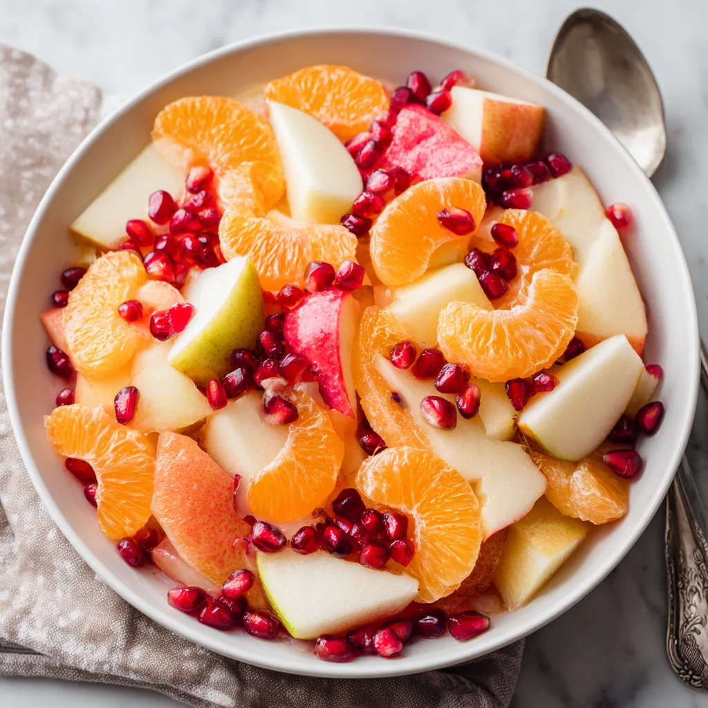 This recipe honors that tradition with care and respect. It is not flashy or complicated, and that is exactly its strength. Each fruit is chosen for its winter peak flavor—juicy oranges, crisp apples, tender pears, and vibrant pomegranate seeds. Together, they create a bowl that feels cheerful, familiar, and welcoming. A light citrus touch gently enhances the natural sweetness without masking it, allowing the fruit to speak for itself.