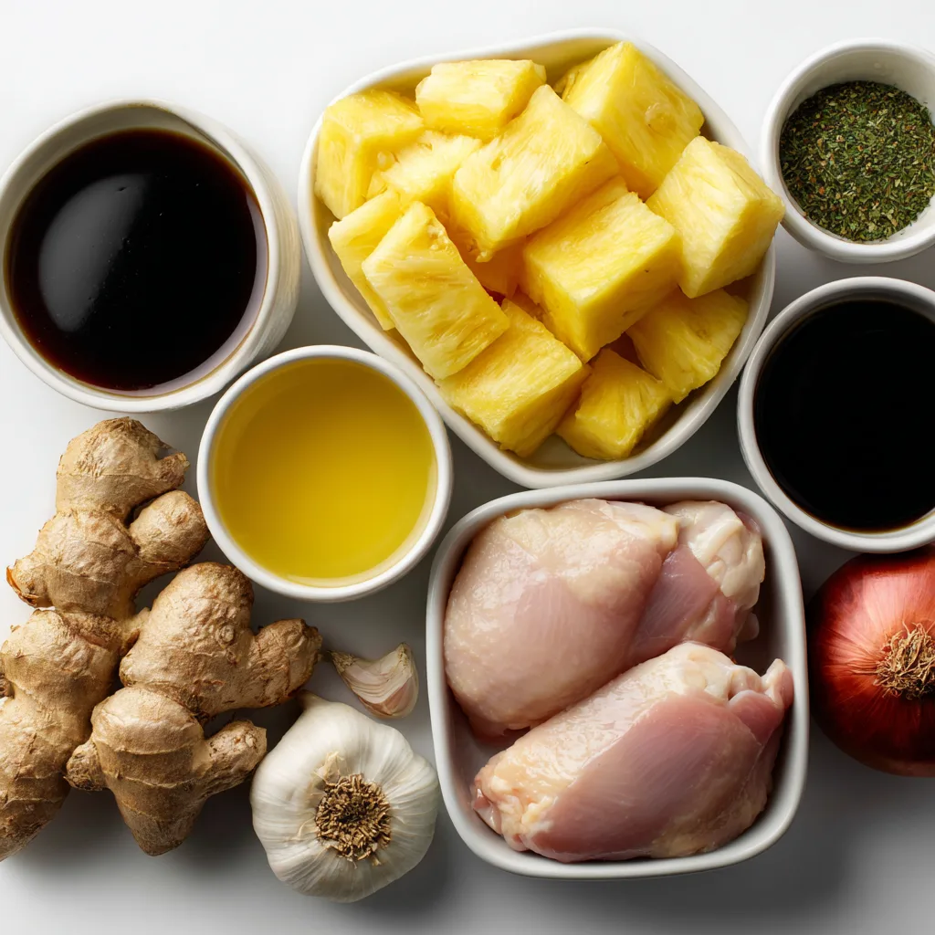 - In a bowl whisk together pineapple juice, soy sauce, brown sugar, garlic, ginger, rice vinegar, and sesame oil.