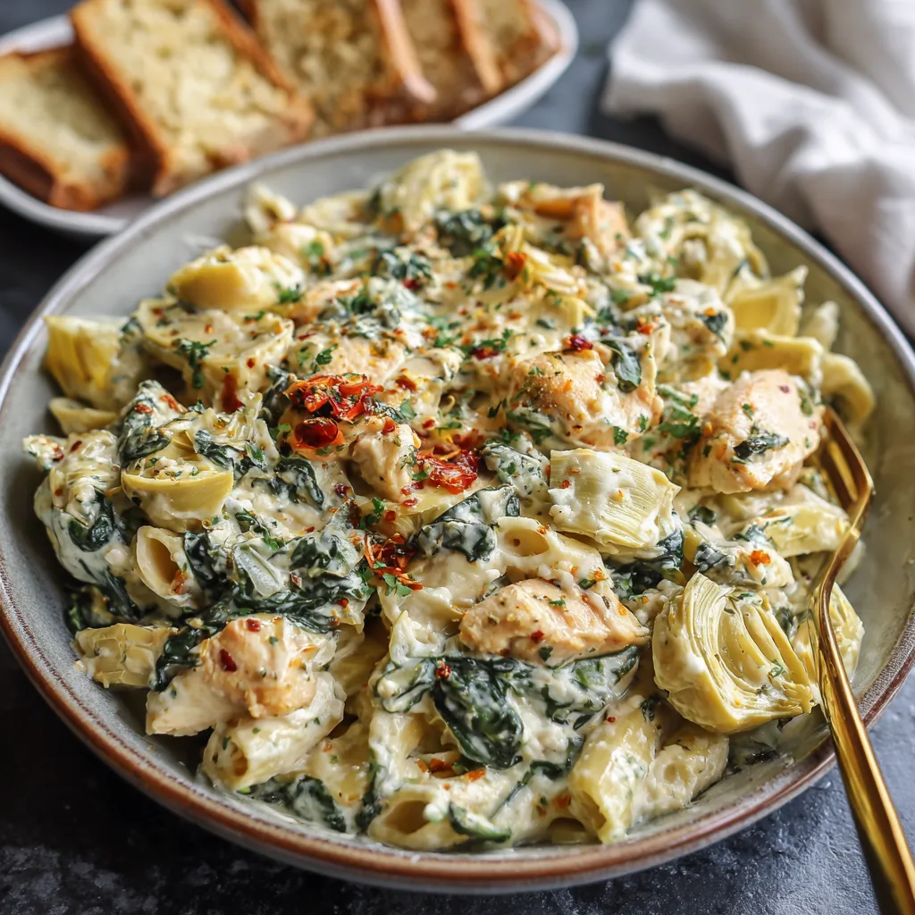 Hi there, food lover! 👋 Ready for something that brings creamy comfort and bright Mediterranean flavors together in one cozy dish? Our Spinach Artichoke Chicken Pasta is everything you love about the classic spinach-artichoke dip — warm, cheesy, and perfectly garlicky — now transformed into a full, hearty meal. 🍗🌿