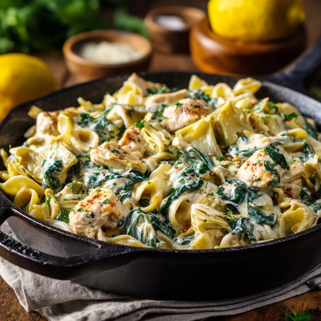 This traditional-style recipe hails from kitchens that know the value of wholesome, feel-good food that satisfies every craving. Imagine tender chunks of chicken simmered in a rich, velvety sauce with tangy artichokes, fresh spinach, and a gentle kiss of Parmesan cheese. Served over perfectly cooked pasta, it’s the kind of dish that makes the whole house smell like love. ❤️