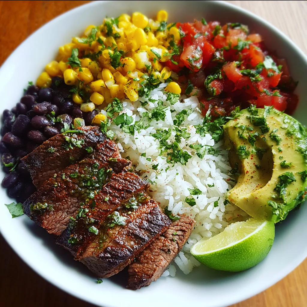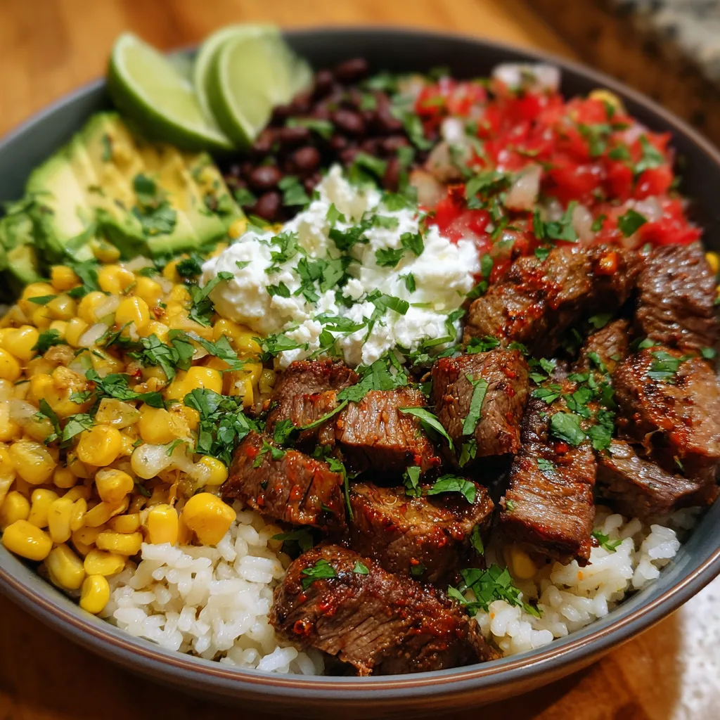 Juicy steak, seasoned and seared to perfection, serves as the centerpiece of this bowl. Beneath it rests fluffy cilantro lime rice, brightened with citrus and herbs, offering a refreshing contrast to the rich, savory beef. Fresh toppings like beans, corn, and avocado bring color, texture, and nourishment, turning this dish into a complete and satisfying meal.