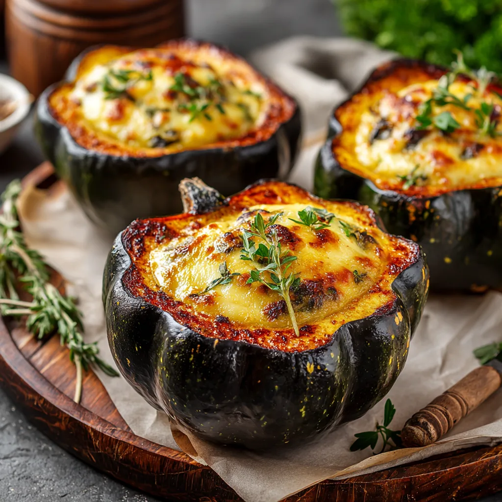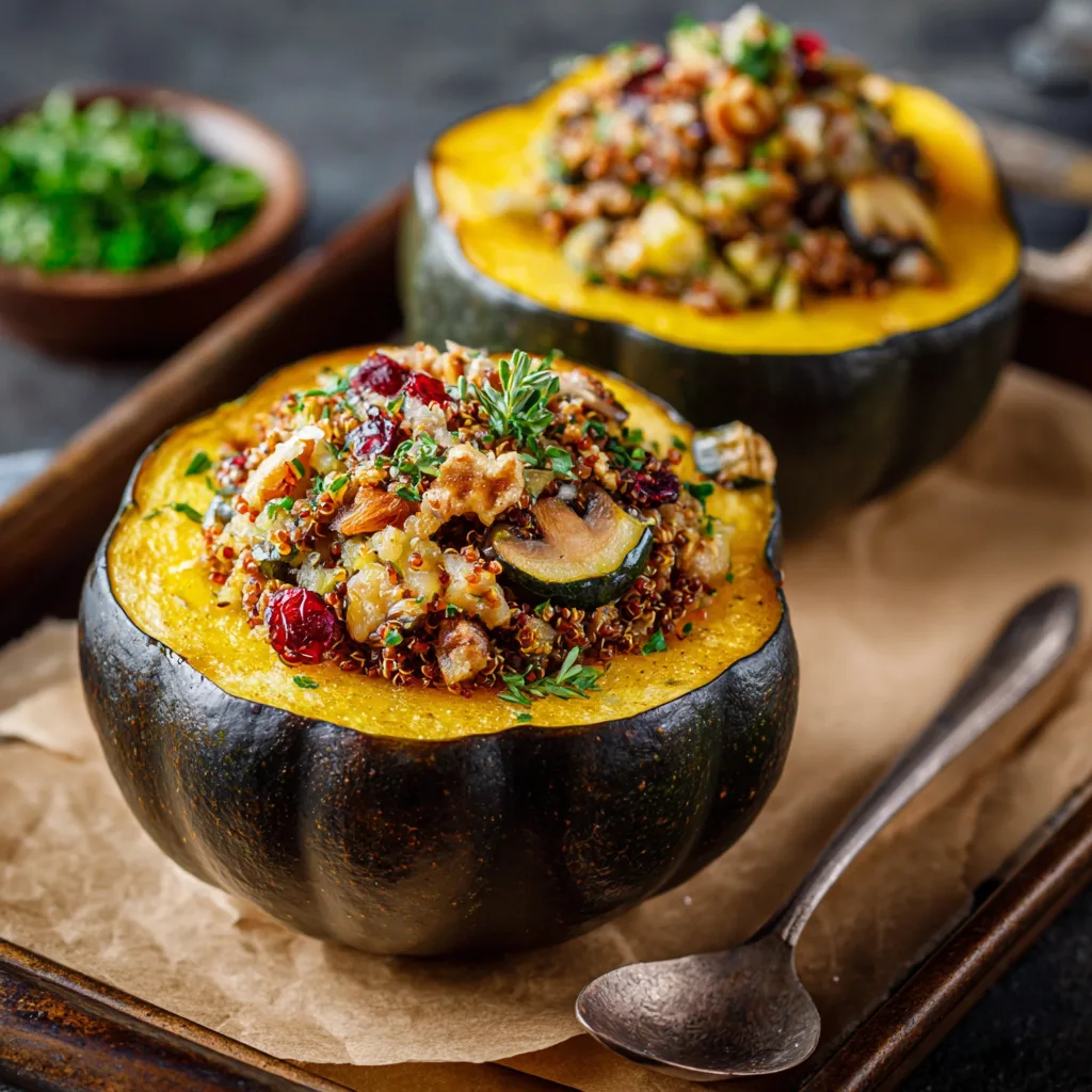 Acorn squash, with its tender golden flesh and mild sweetness, makes the perfect edible bowl for a rich stuffing of grains, vegetables, herbs, and sometimes a touch of meat or nuts. When roasted, its natural sugars caramelize beautifully, giving each bite a melt-in-your-mouth texture. The savory filling—brimming with onions, celery, mushrooms, and warm spices—balances the sweetness, creating a harmony that feels like a hug in every bite. 🤗