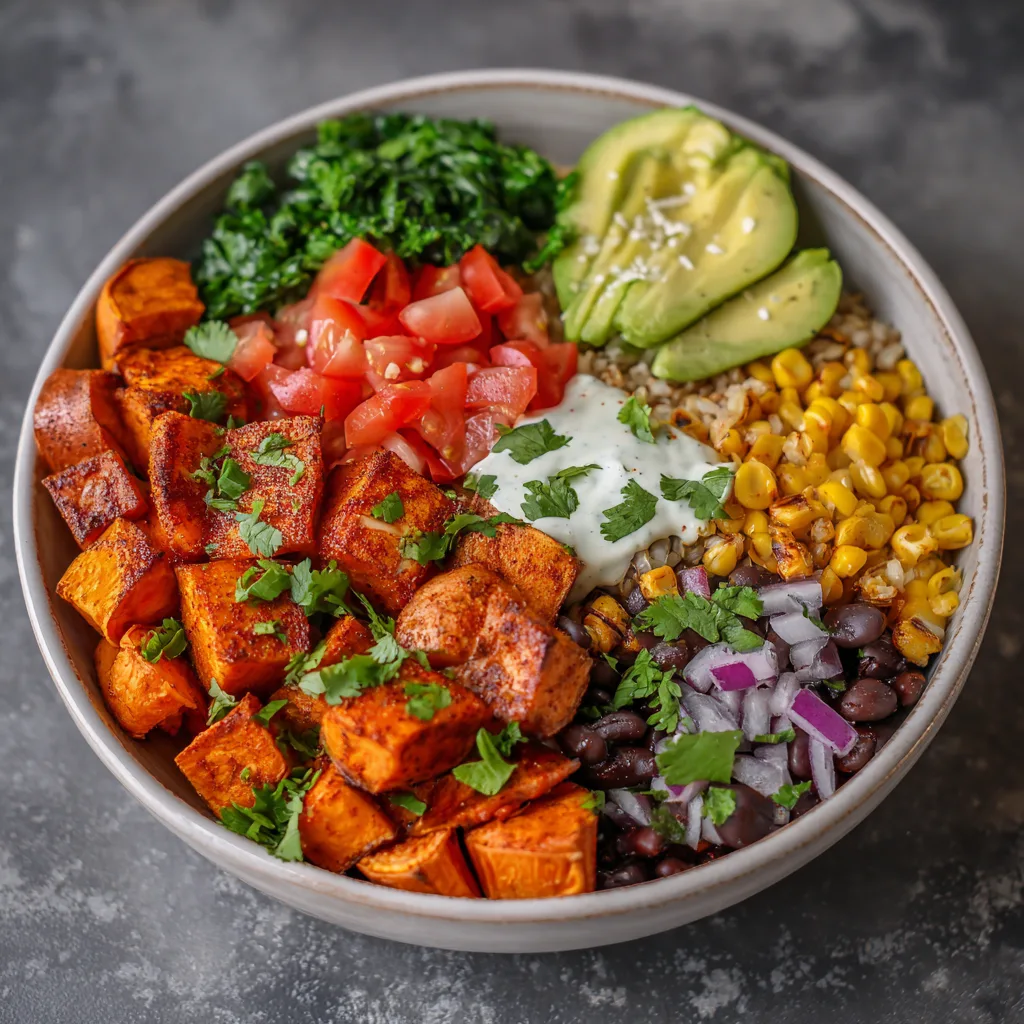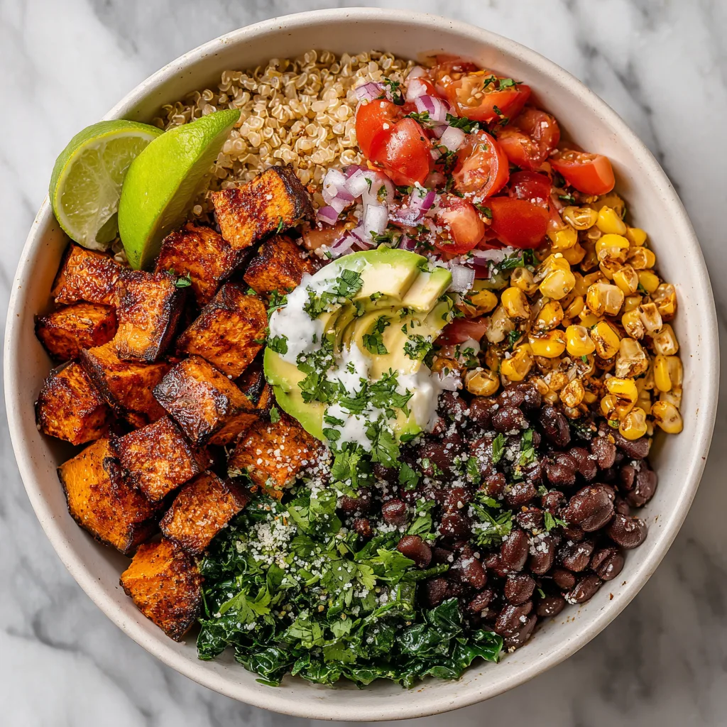 This colorful, satisfying dish combines roasted sweet potatoes, hearty black beans, and a medley of vibrant toppings—all drizzled with a creamy lime dressing that ties it beautifully together. Inspired by wholesome Latin flavors and modern plant-based cuisine, this bowl strikes the perfect balance between hearty and healthy. Each bite is a mix of smoky, zesty, and sweet notes that dance together in perfect harmony.