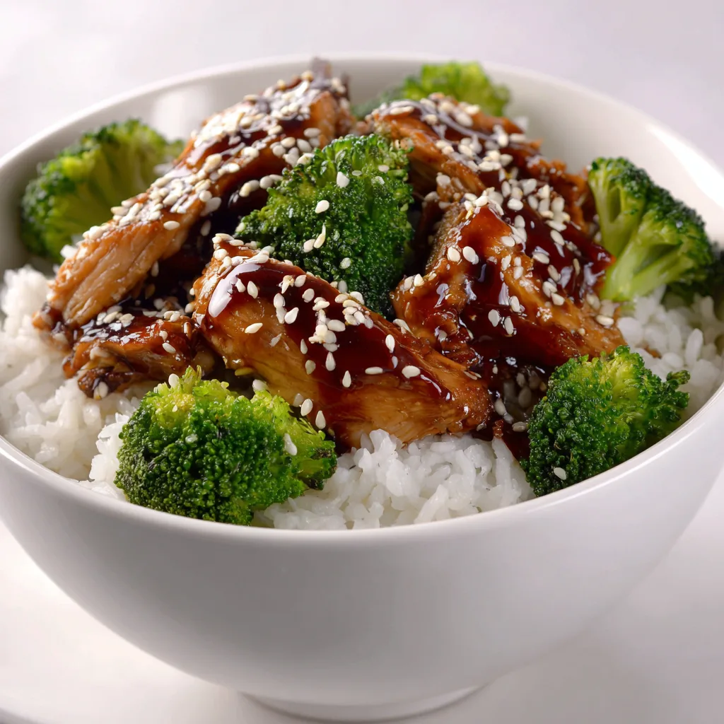 A comforting and traditional-style teriyaki chicken bowl with tender chicken glazed in a rich savory-sweet sauce, served over fluffy rice with fresh broccoli.