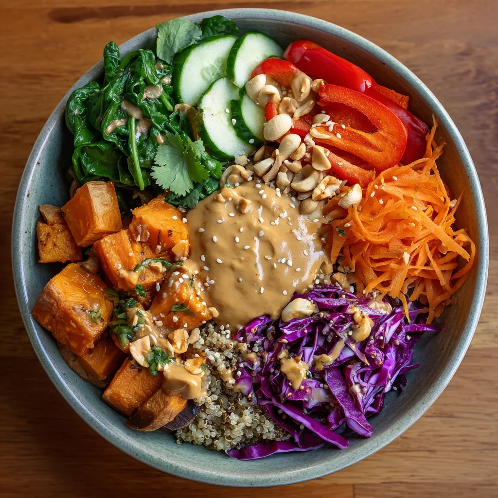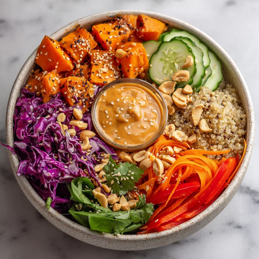 Originating from the idea of a “Buddha bowl” — a wholesome, plant-based meal that combines grains, greens, and proteins in one beautiful bowl — this version takes inspiration from traditional Thai flavors. The creamy peanut sauce, the caramelized roasted sweet potatoes, and the crisp, vibrant veggies all come together in perfect harmony. Each bite is a dance of sweet, savory, tangy, and a hint of spice. 🥜🌶️