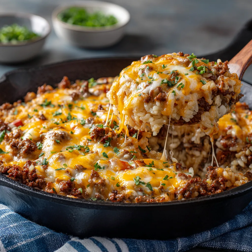 Sprinkle with Parmesan and fresh parsley for a touch of color and flavor. Serve hot right from the pan — that first spoonful of cheesy, beefy rice is pure joy! 😋