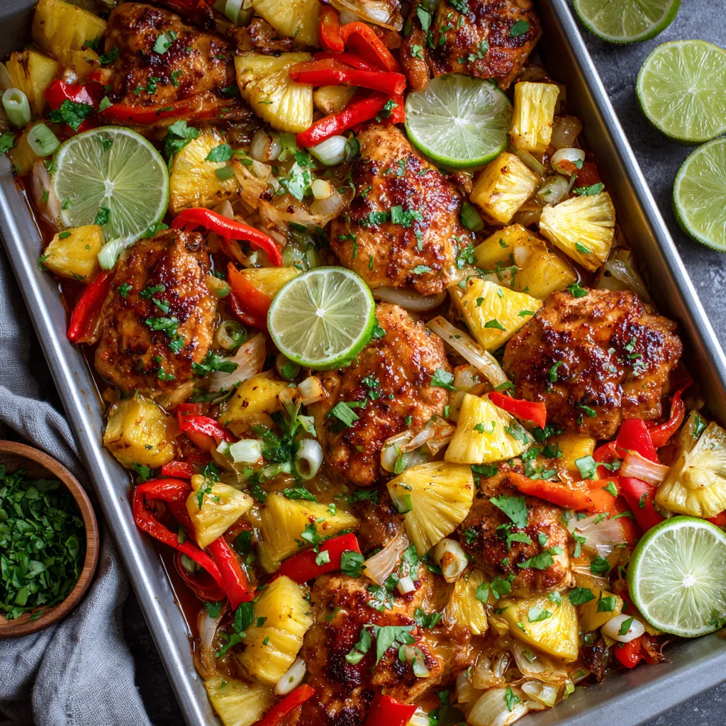 This Whole30 Hawaiian Chicken Sheet Pan Dinner is one of those recipes that feels joyful the moment it hits the oven. Inspired by the sweet-and-savory flavors of Hawaiian-style cooking, this dish brings together tender chicken, juicy pineapple, and colorful vegetables—all roasted together on one pan for ease and simplicity. 🌴🍍🍗